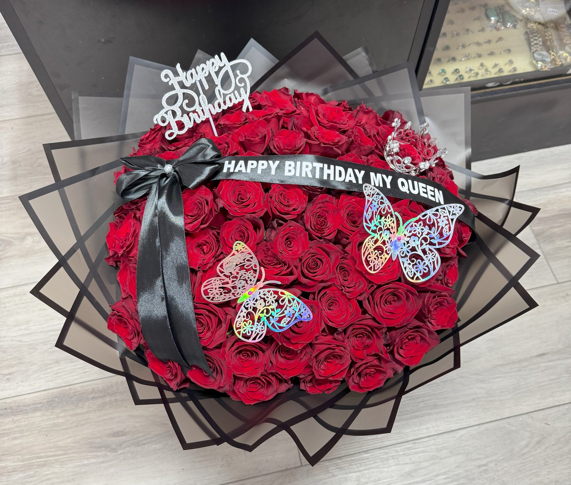 100 rose buchon bouquet you can choose the color of your preference upon availability, option of just butterflies and crown or have all the beautiful toppings to give a wonderful presentation. you have to call the store for pricing. we need at least one day in advance to order, for special holidays 3 days in advance